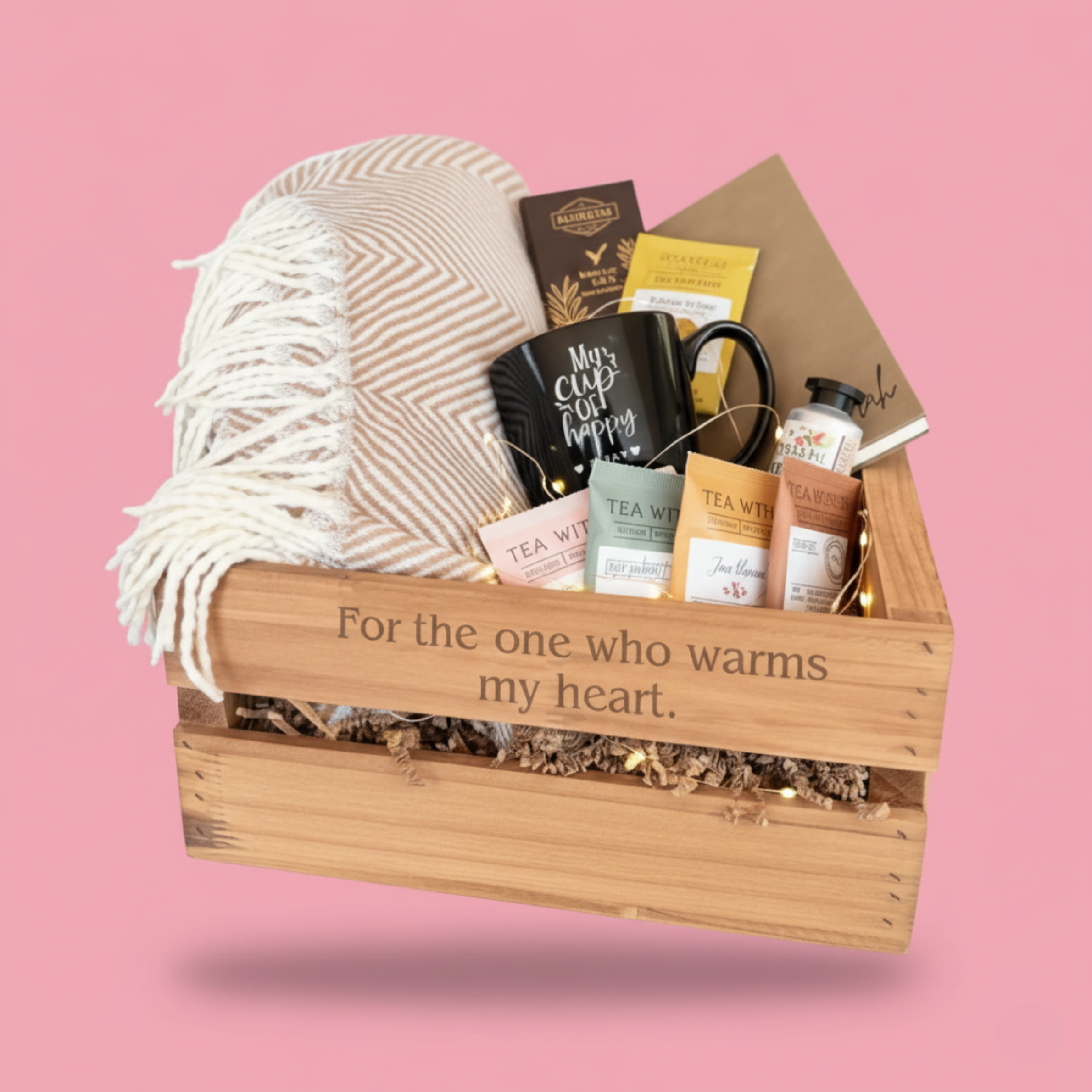 Pamper her with the Cozy Comfort Gift Set, a heartfelt selection of items for relaxation and warmth. This handcrafted cedar crate includes tea sachets, a 16oz ceramic mug, a faux leather journal, and a cozy throw blanket.