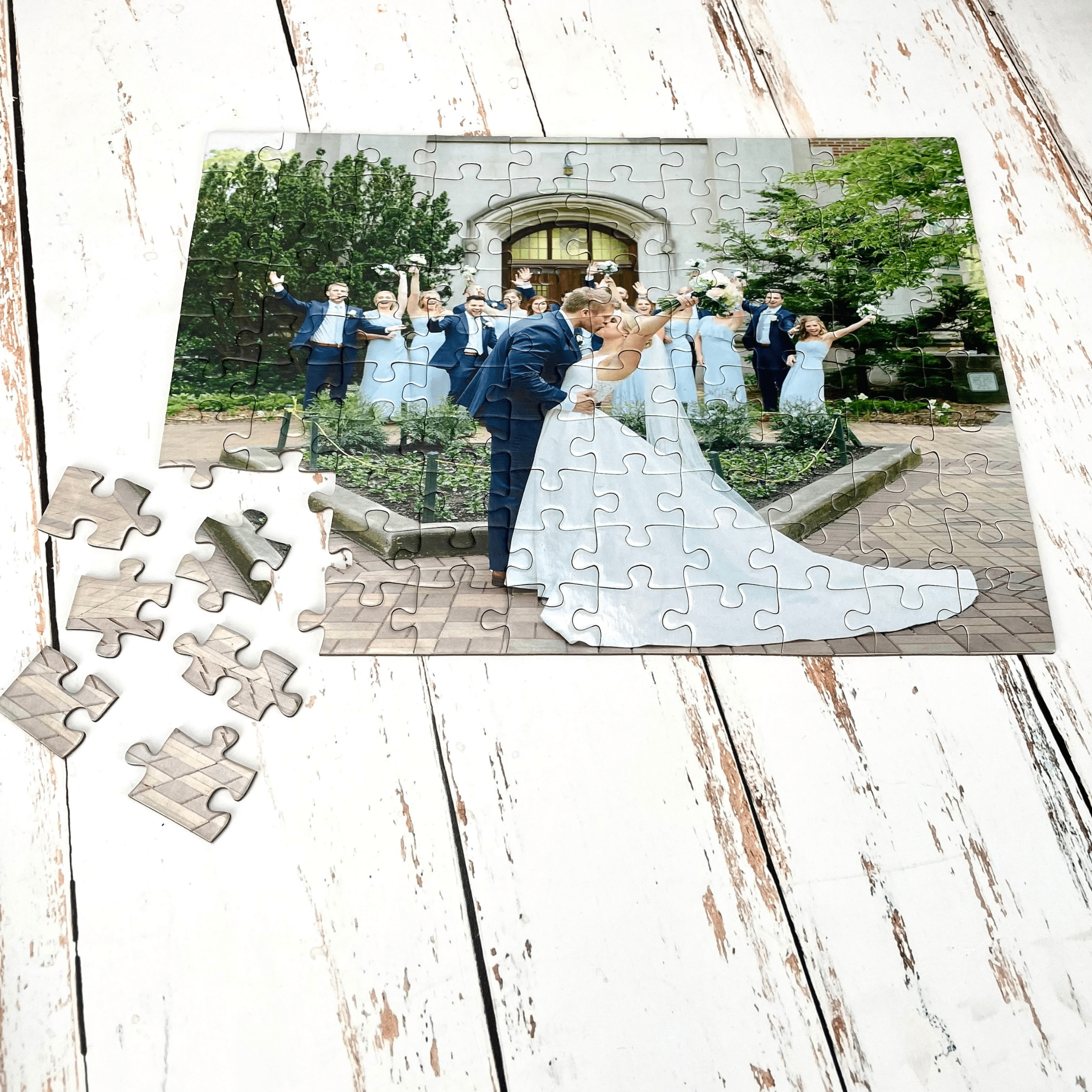 Celebrate your special anniversary with a uniquely personal gift. This puzzle features a cherished wedding photo, capturing a magical kiss with friends cheering in the background. Measuring 8.25" x 11.5" when assembled, the puzzle consists of 100 durable cardboard pieces, each permanently UV printed for long-lasting memories.