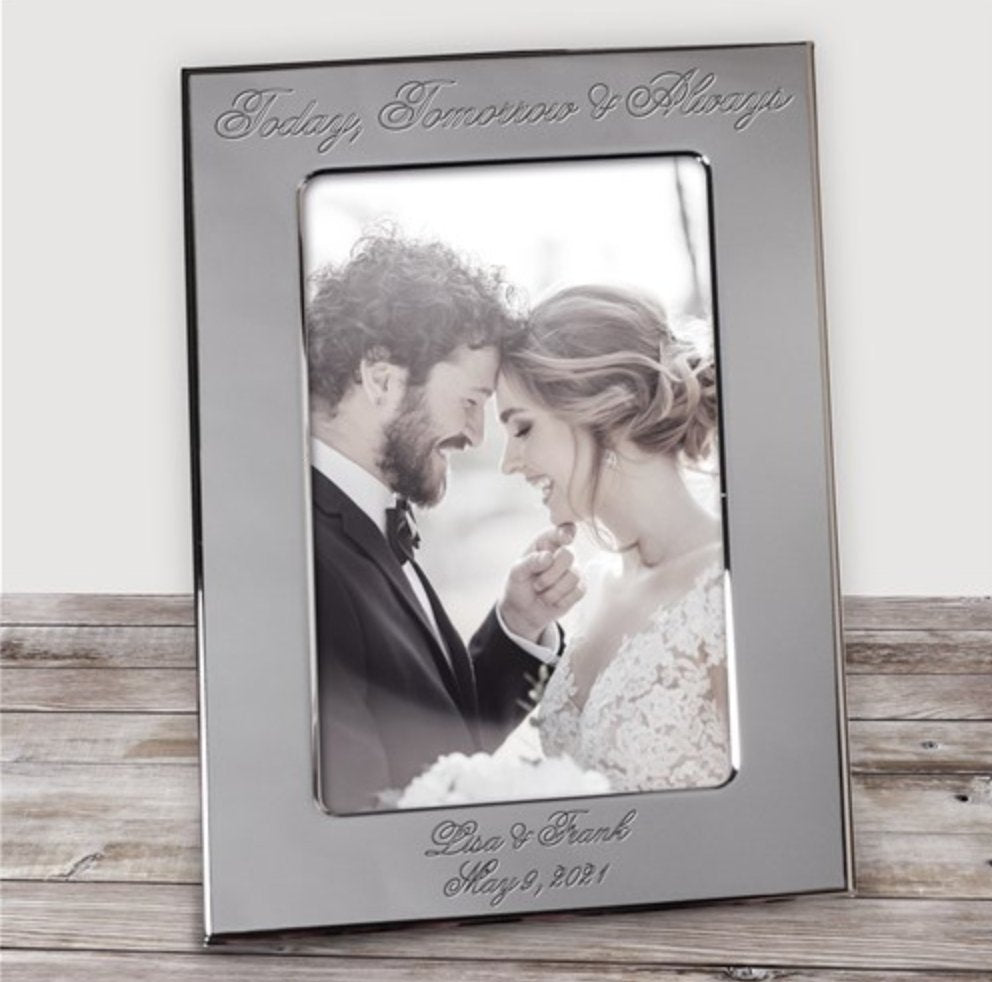 This silver frame holds a 4x6 and 3 1/2x 5 photo and includes an easel back for an easy shelf display. This classy picture frame has a silver finish that is laser engraved with the beautiful saying "Today, Tomorrow, & Always". This can be personalized with your and your man's name and your anniversary date.