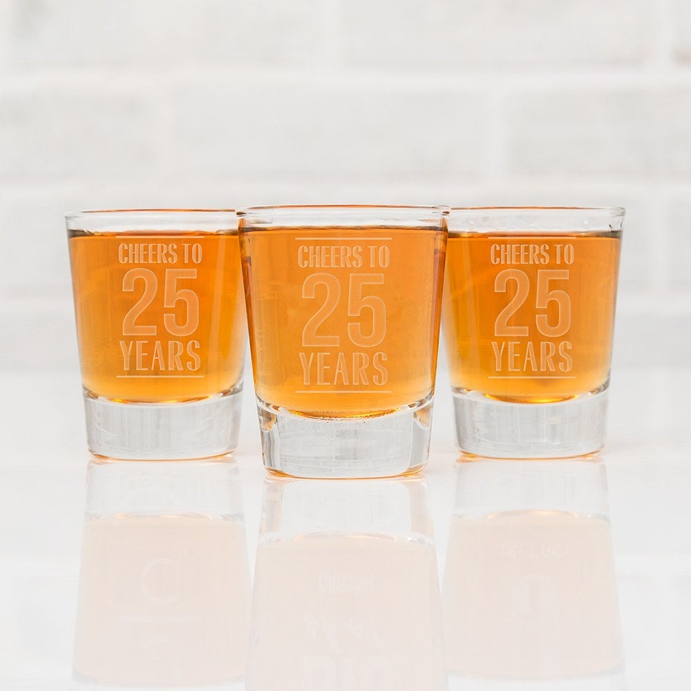 This shot glass is 2.5 inches in height and holds 2.25 ounces of your favorite alcohol. This item is able to be personalized with how many years the birthday is.