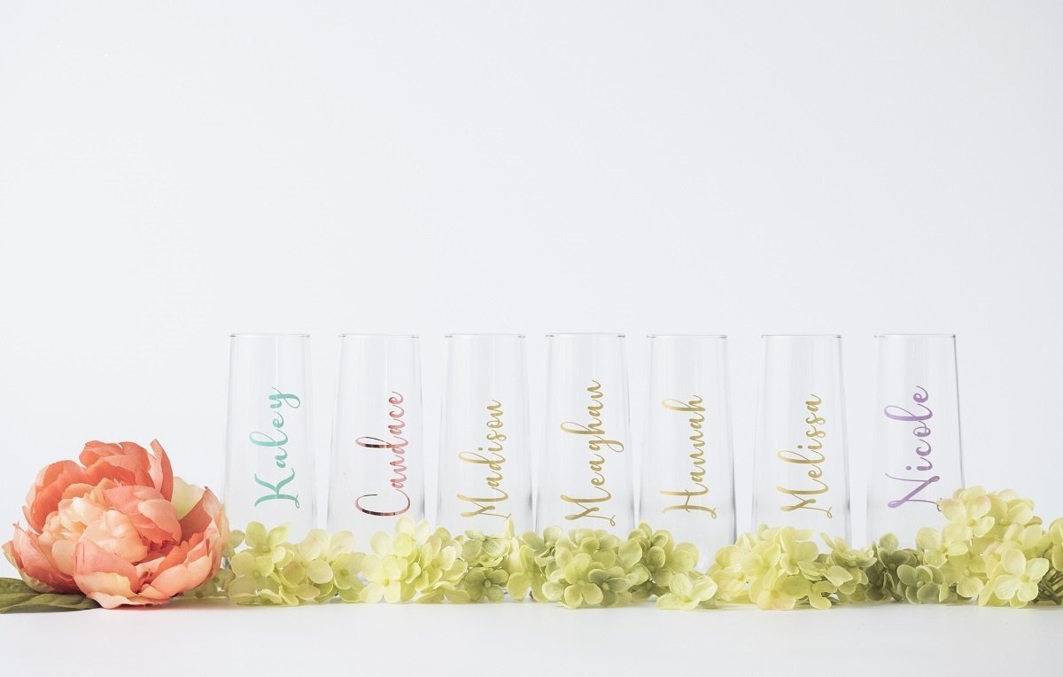 A nod to minimalism, these classy, stemless champagne flutes are truly en vogue. Let’s picture the morning of your wedding. There you are, surrounded by the most fabulous women of your life.
