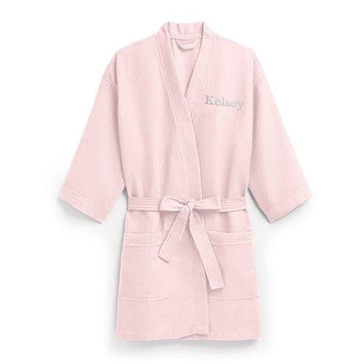 This cozy robe features an all-over waffle knit, a luxury cotton and polyester blend and an adjustable tie belt for maximum comfort. It even has real pockets! Choose from five beautiful colors and have it embroidered with each bridesmaids’ name, free of charge.