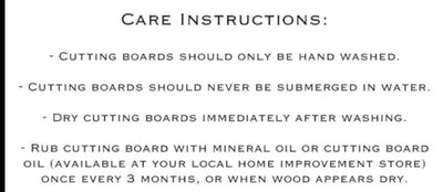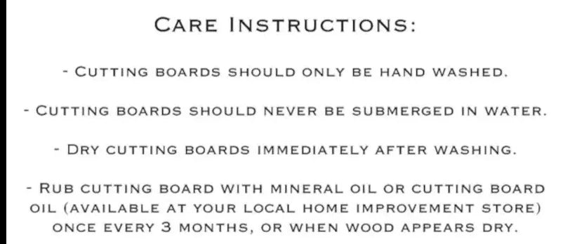 Our boards are made from American lumber! All of our cutting boards are hand-made at another small family-run business. Buying from a small business means your cutting boards are hand-selected and inspected for quality. After engraving our boards are hand finished with food-safe oils to preserve the beauty of the natural wood for months. All of our cutting boards come with care instructions to keep your board looking like new for years to come!