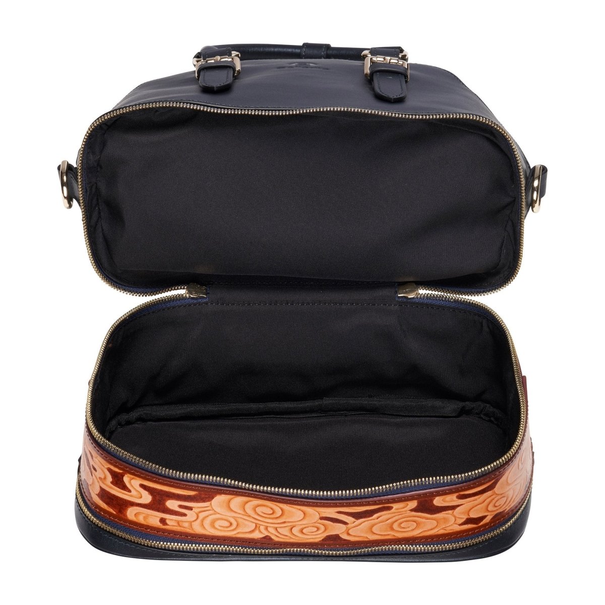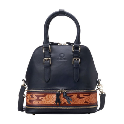 This ultimate blue satchel bag crafted with our “Glorious Clouds” carved leather motif will be the bag you reach for time and again. A symphony of expert craftsmanship, historic ancient oriental design and modern leather artistry combine to form a shining example of the finest luxury leather handbags available today. With an abundance of plush zippered compartments, every precious item will have its’ own special location, protected by a deluxe, supple fabric lining and the good omen of the “Glorious Clouds” meaning "luck". A superlative handbag in any language.