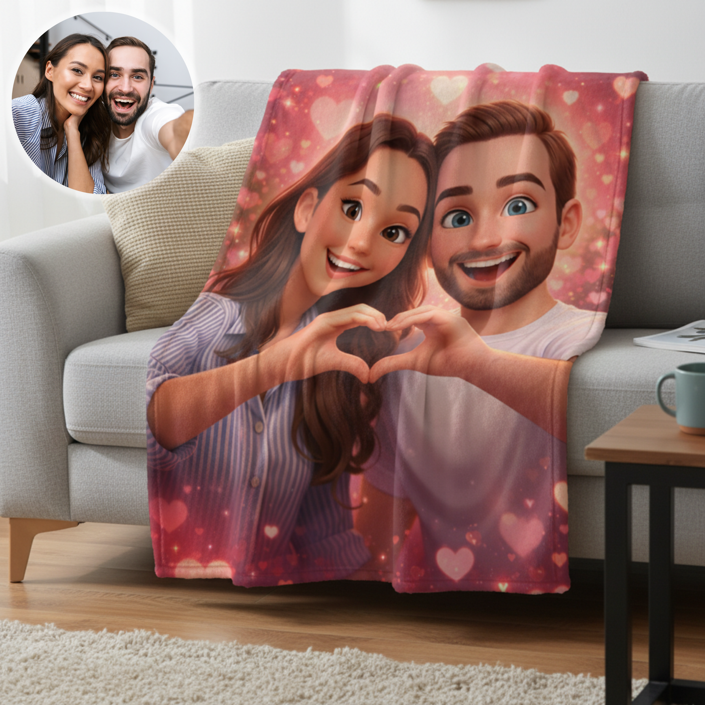 What makes this blanket truly one-of-a-kind is our exclusive AI "Heart-Hands" Animation. When you upload a photo of you and your boyfriend, husband, or best friend, our AI doesn't just animate you—it reimagines your pose so that your hands meet in the middle to form a perfect heart. Surrounded by floating hearts and vibrant colors, it’s a dreamy, animated tribute to your unique bond.