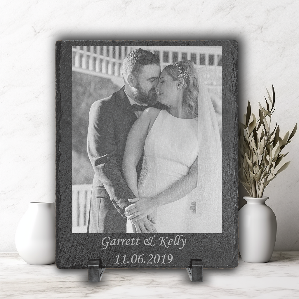 Crafted from real slate, each frame is naturally unique in color and shape, adding rustic elegance to any room. The photo is thoughtfully framed in a circular design, with two lines of personalized text underneath — perfect for your names, a favorite quote, or an "established" date. Complete with a stand for easy display, this frame becomes a daily reminder of the love you share — a meaningful keepsake she’ll treasure for years to come.