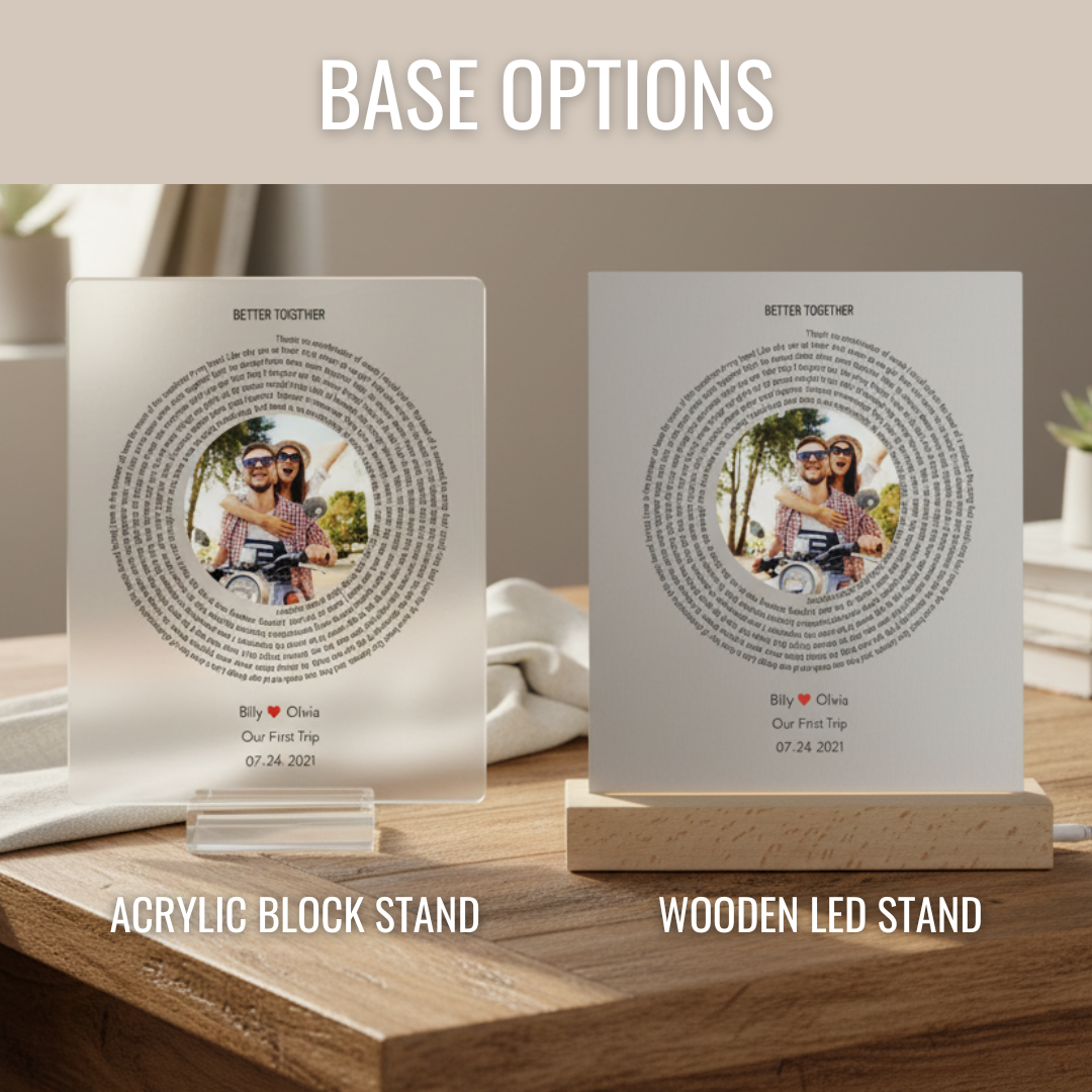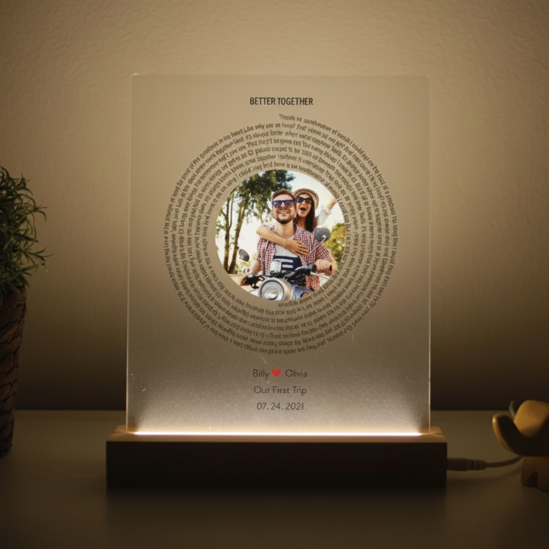 Made from durable, high-quality acrylic, this plaque is available in two sizes and can be displayed on either a sleek acrylic stand or a warm wooden LED base that softly lights up your design. It’s the perfect gift for Valentine’s Day, anniversaries, weddings, or any occasion where you want to say you mean the world to me.