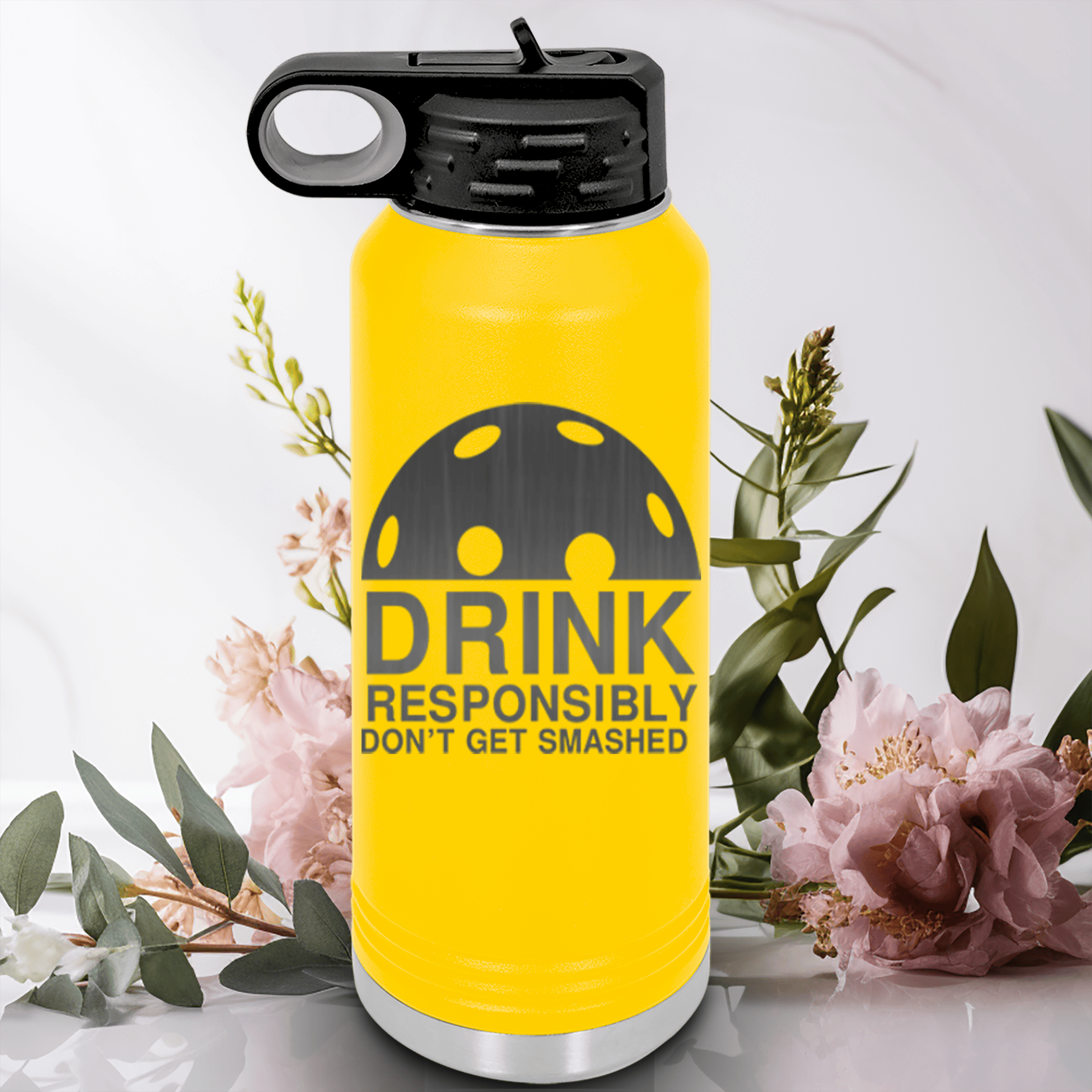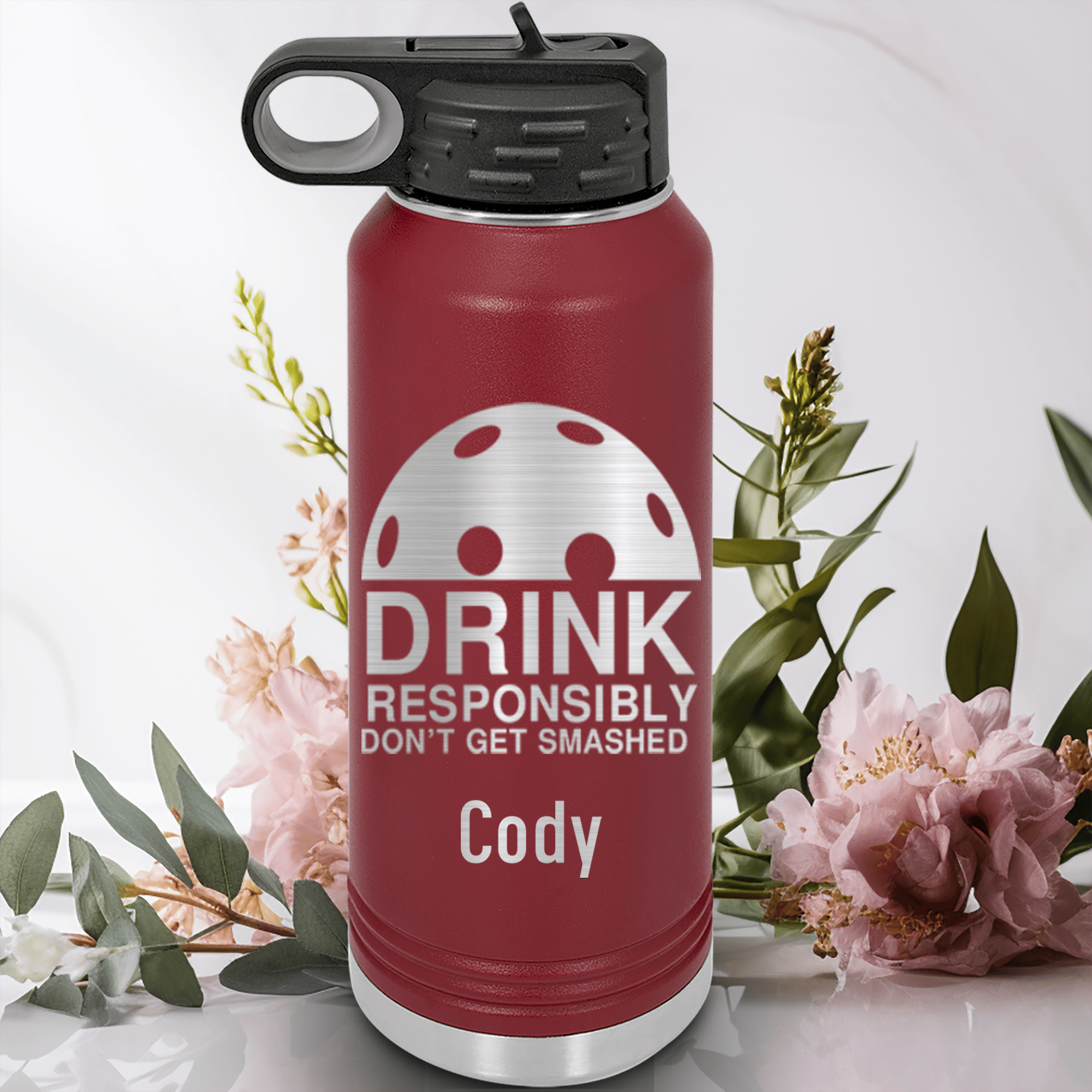 This stainless steel 32 oz water bottle is not only durable but also stylish with its laser engraved pickleball theme. Choose from 17 color options to match your personal style. The cap features a flip open straw for easy sipping, while the double wall insulation ensures optimal temperature control during intense matches.