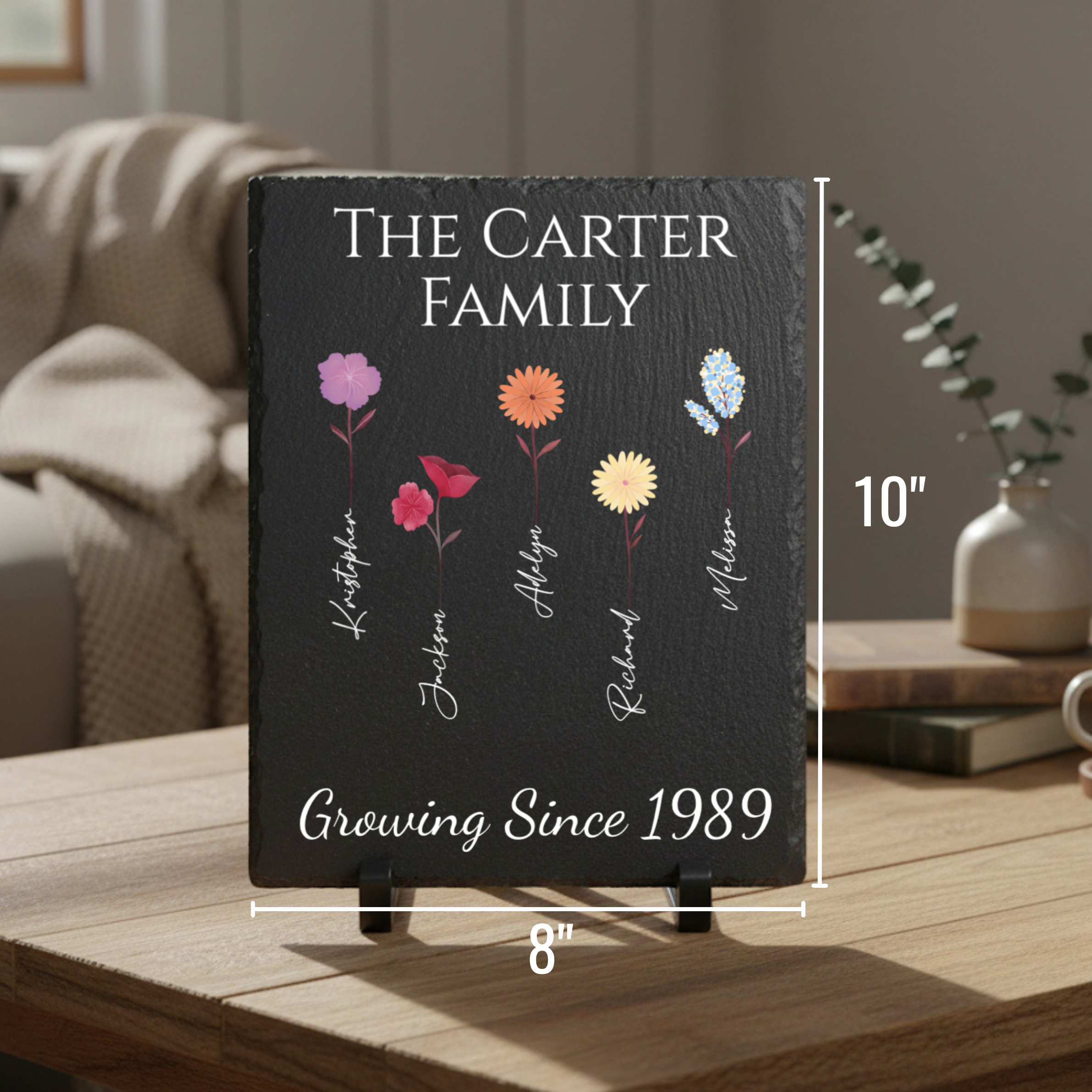 Crafted from genuine slate stone, this sign brings a natural, earthy charm to any shelf, mantle, or desk. Personalized with your family’s names and floral selections, it's more than just décor — it’s a daily reminder of her blooming legacy.