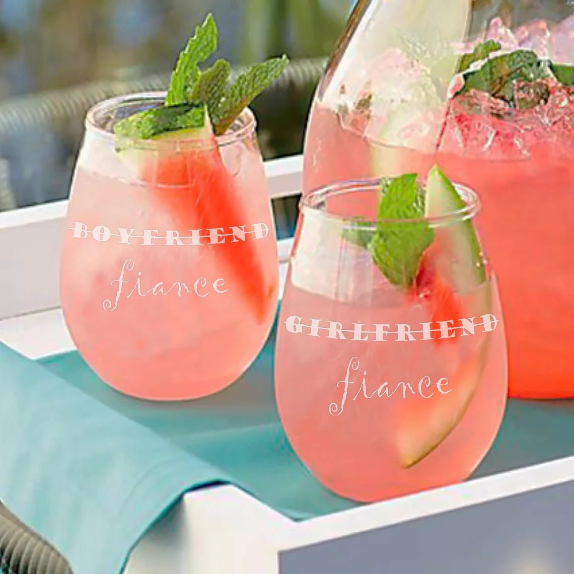 Introducing our "Fiance" wine glass or whiskey glass - the perfect way to celebrate your recent engagement! Each elegant glass option is the upgraded version of the traditional "boyfriend" or "girlfriend" glass, and is the perfect way to toast to your new status as fiancé. The sleek design and premium glass construction make it a beautiful addition to any home bar or kitchen. With its unique design, this glass is sure to be a conversation starter at any party or gathering. Raise a glass to your new chapter in life with this sweet glassware!