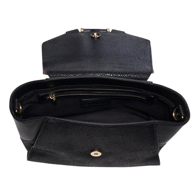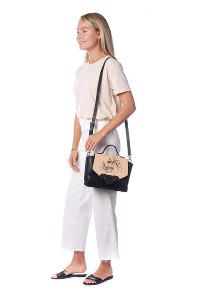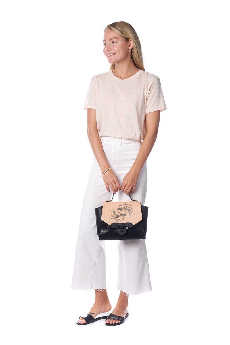 As a brilliant combination of Bellorita heritage, craftsmanship and on-trend style, frisky fish, grace this masterpiece. The sumptuous black leather accented with the original color, along with pearl enhancements create a true work of art. The handbag features sturdy top handles. The dainty pearls suggest innocence and virtue. This incredible handbag adds a note of free-spirited chic to day or evening looks. There is an epitome of effortless elegance and totally swoon-worthy.