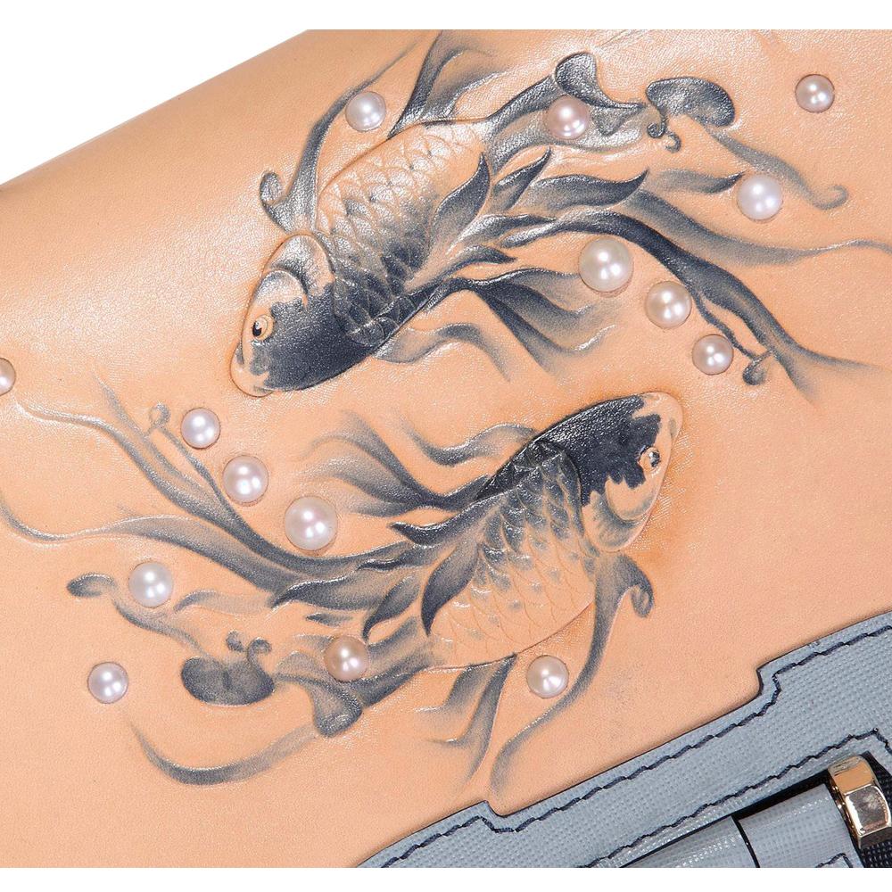 As a brilliant combination of Bellorita heritage, craftsmanship and on-trend style, frisky fish, grace this masterpiece. The sumptuous deep blue leather accented with the original color, along with natural pearl enhancements create a true work of art. The handbag features sturdy top handles. The dainty pearls suggest innocence and virtue. This incredible handbag adds a note of free-spirited chic to day or evening looks. There is an epitome of effortless elegance and totally swoon-worthy.