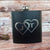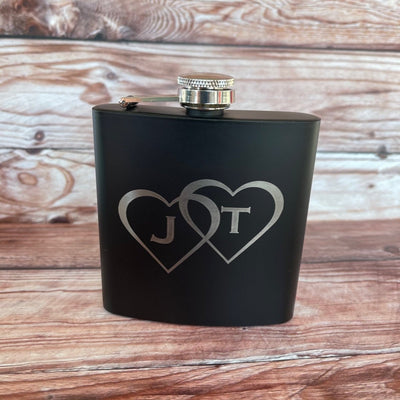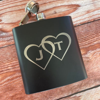 The dimensions for this matte black flask are 3 5/8" length x 4 3/8" height, the right size for any pocket or jacket pocket. This flask can be easily personalized by adding yours and his initials to the personalization box at the top of the page. Please follow example below.