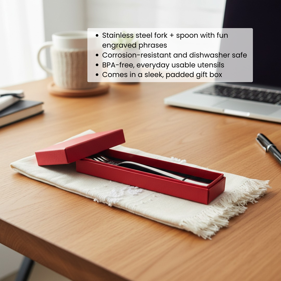 Stir up some romance with the playful "Fork Now, Spoon Later" set, a trio that's bound to be the highlight of any couple's Valentine's Day. This set includes a fork and a spoon, each bearing the cheeky phrases that promise both a meal shared and coziness to come. The utensils are crafted from durable stainless steel, promising longevity and a continual reminder of love with every bite and cuddle.