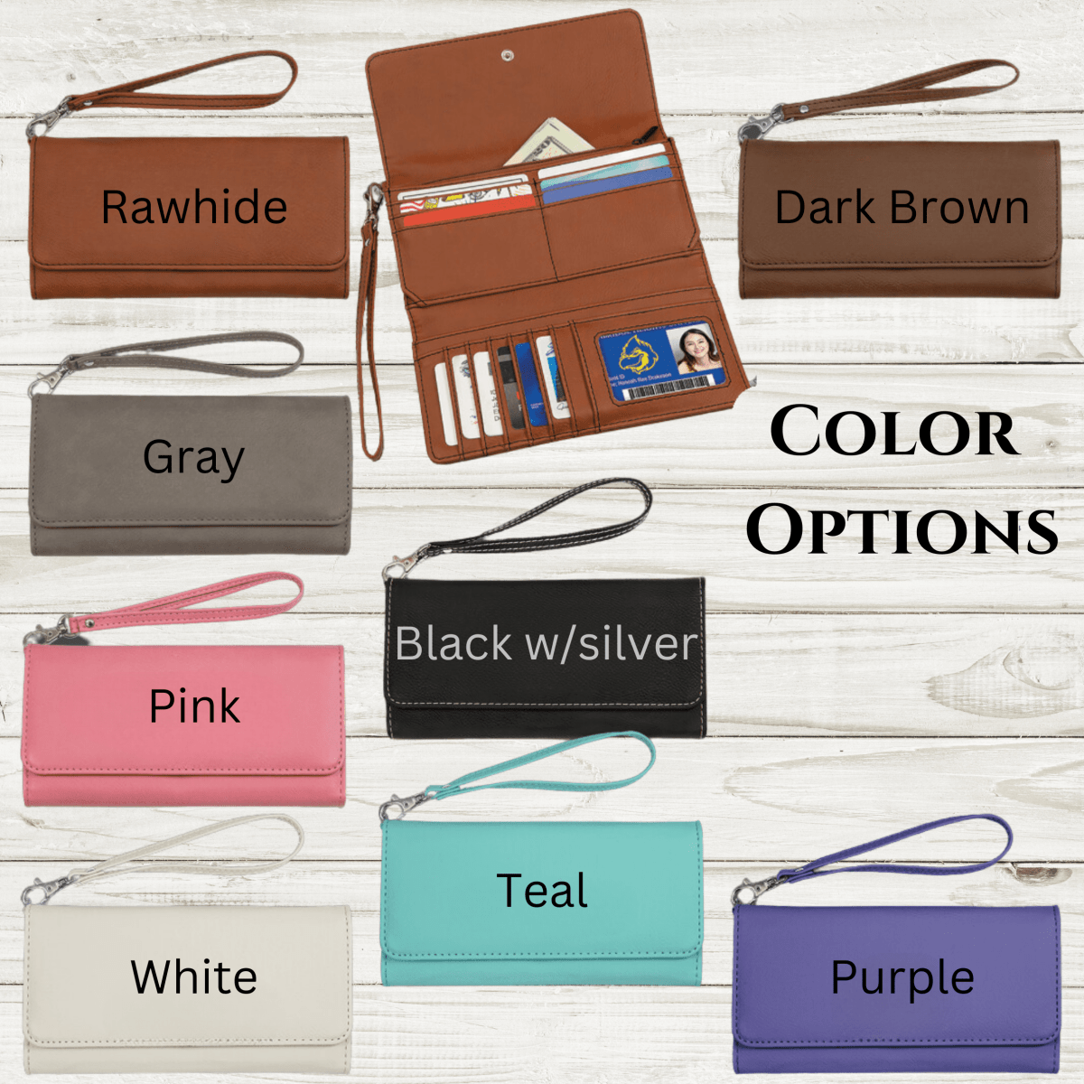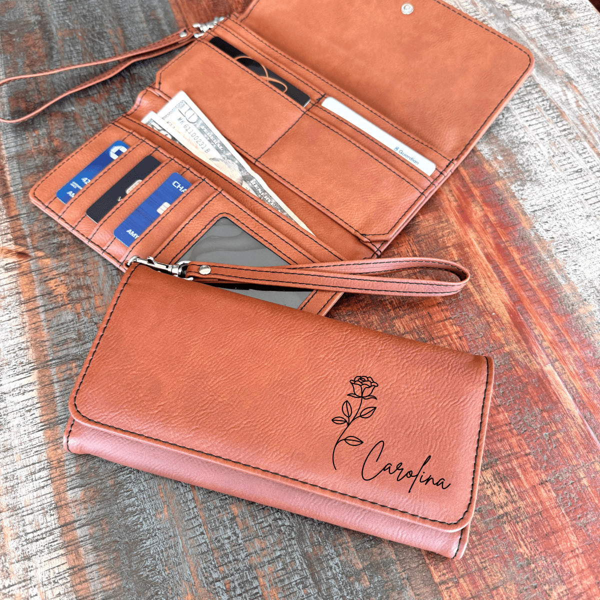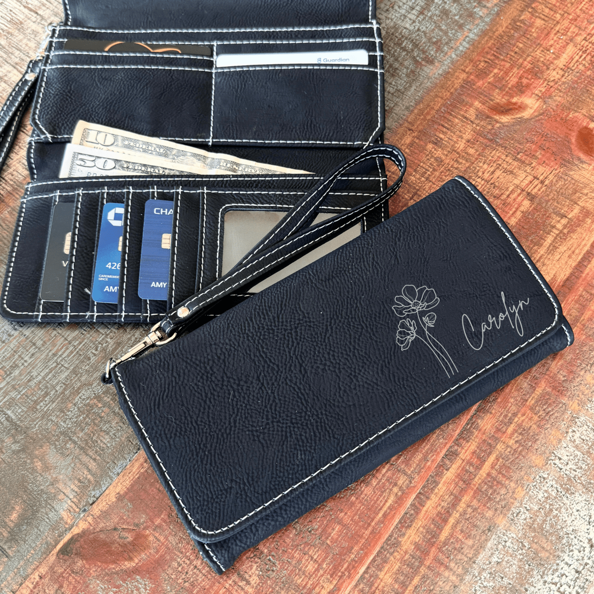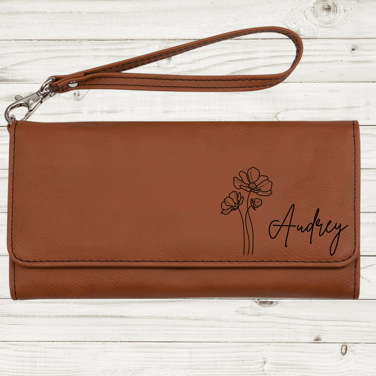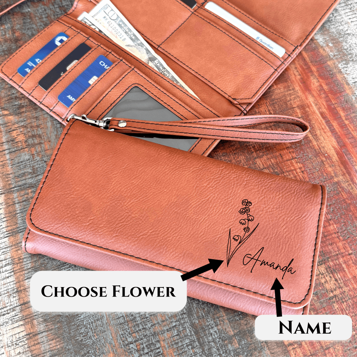 Embrace elegance with our leatherette birth flower wristlet, a stylish blend of function and fashion. Crafted from premium faux leather for durability and a luxe feel, this wristlet measures 7 1/2"(L) x 4"(W). It's designed to organize and secure your essentials with 12 card slots, a dedicated ID slot, and multiple compartments for bills and receipts.