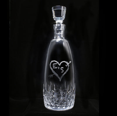 Our Lismore Essence Crystal Waterford Decanter is engraved with a sweetheart and arrow with lovers' initials as if they were carved into an old oak tree by young lovers proclaiming their love ever after. The Waterford decanter is a classic style gift for the man or woman who has everything and those with great taste who enjoy the finer things in life.