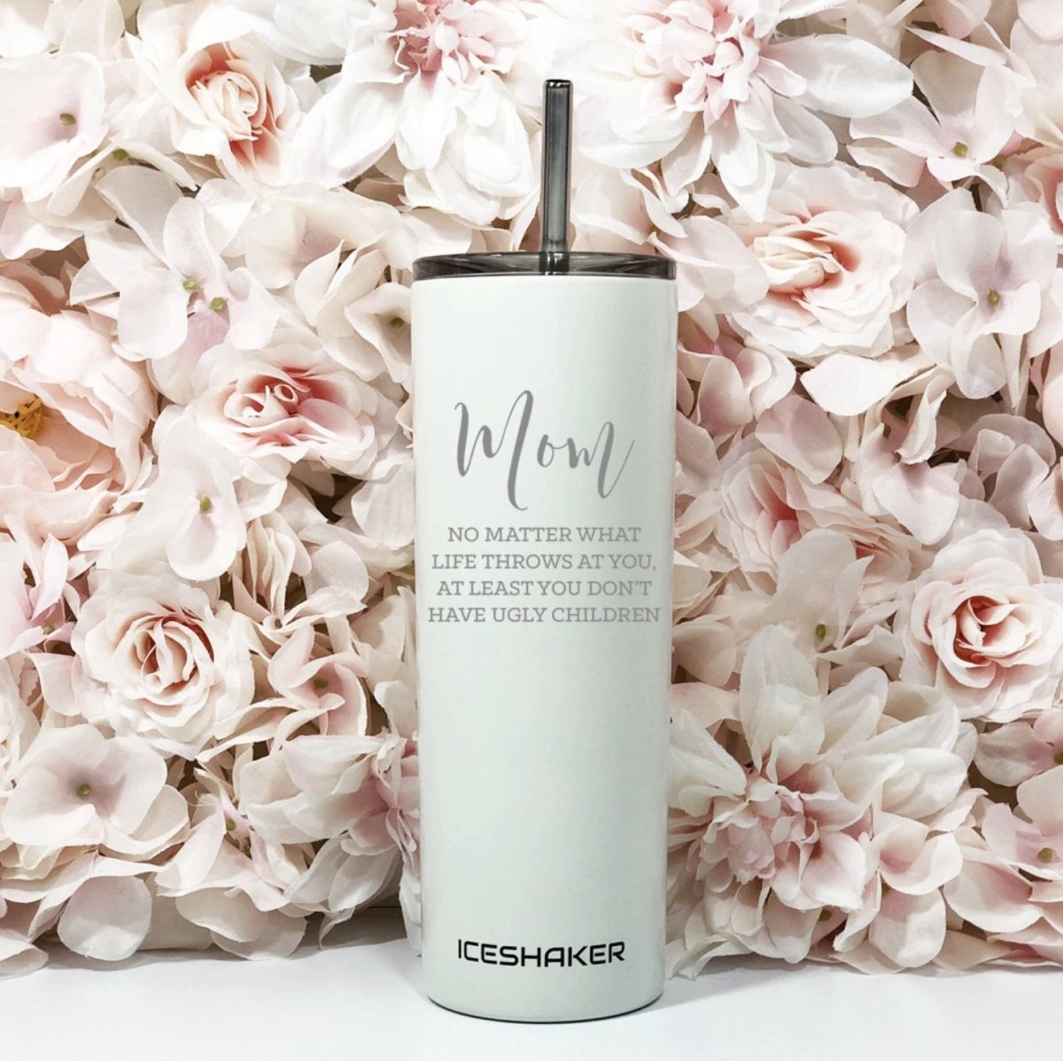 This tumbler is available in a variety of colors that can be customized with your mom's name etched in a script font on the front of the tumbler. This tumbler is made with thick 18/8 stainless steel and a double wall design to keep your drinks insulated. add your personalization to the text box above.