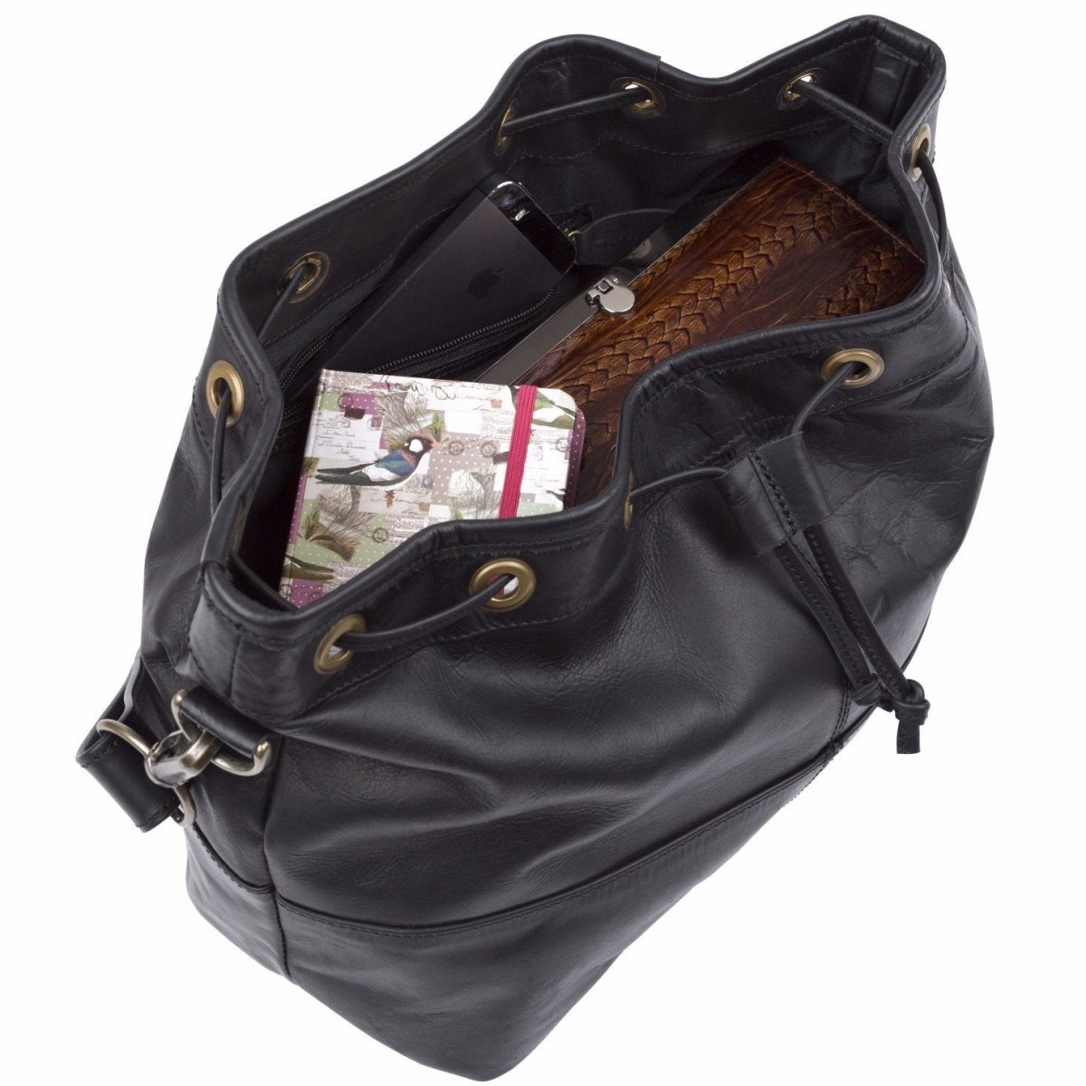 Our Classic Drawstring Bucket Bag in Black is both a stylish and practical day bag. Features include decorative brass eyelets, a robust leather drawstring and an interior zip pocket within the main compartment. This is the perfect accessory for festival-goers and urbanites alike.