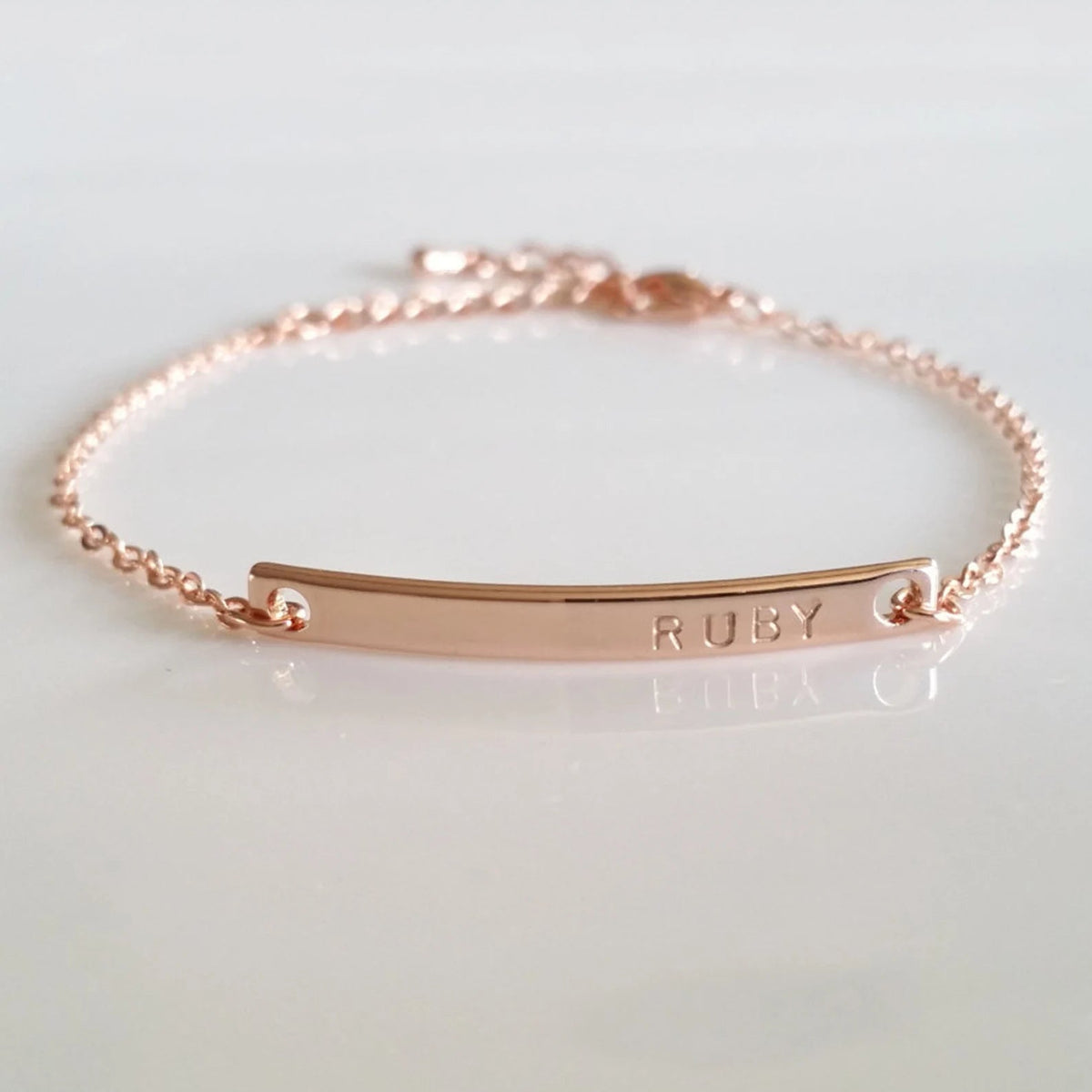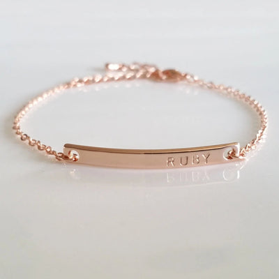 Celebrate her individuality with our Personalized Dainty Bar Bracelet - the perfect blend of simplicity and style. This elegant bracelet features a slender bar pendant that can be engraved with your own custom message, making it a special and unique piece of jewelry that you'll cherish forever. The adjustable chain ensures a comfortable fit for wrist sizes of all shapes and sizes. Made from high-quality metal, this bracelet is both durable and lightweight, making it suitable for everyday wear. Whether you want to commemorate a special date, inscribe a meaningful word or phrase, or just add a touch of personal flair to your look, the Personalized Dainty Bar Bracelet is a perfect choice. It also makes a wonderful gift for a loved one or friend.