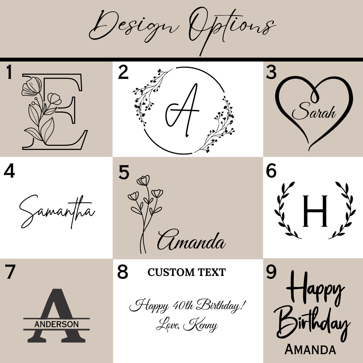 For designs 3, 4, 5, 7, 9: Personalize with a name. Great for adding a full name or first name, ideal for special gifts and occasions.
