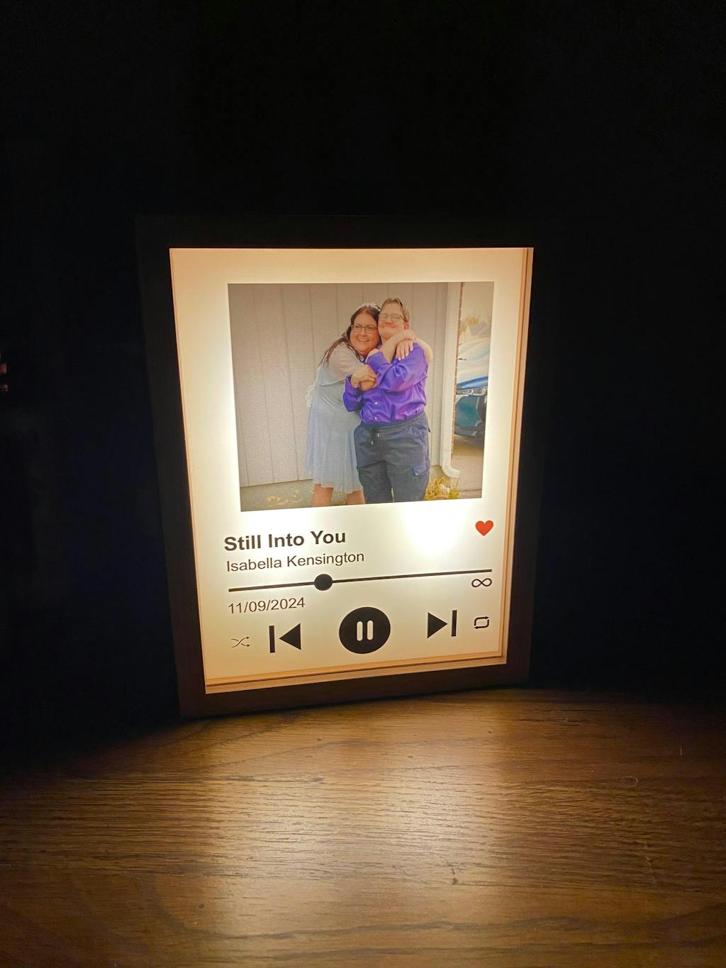 Capture your favorite moment and turn it into a glowing reminder of your connection with this stunning custom Spotify song frame. Whether it's your favorite love song, a memory from a besties road trip, or a song that reminds you of Mom’s hugs, this keepsake instantly melts hearts. Watch her face light up—literally and emotionally—when she sees your shared photo, special song, and message shining softly on display.