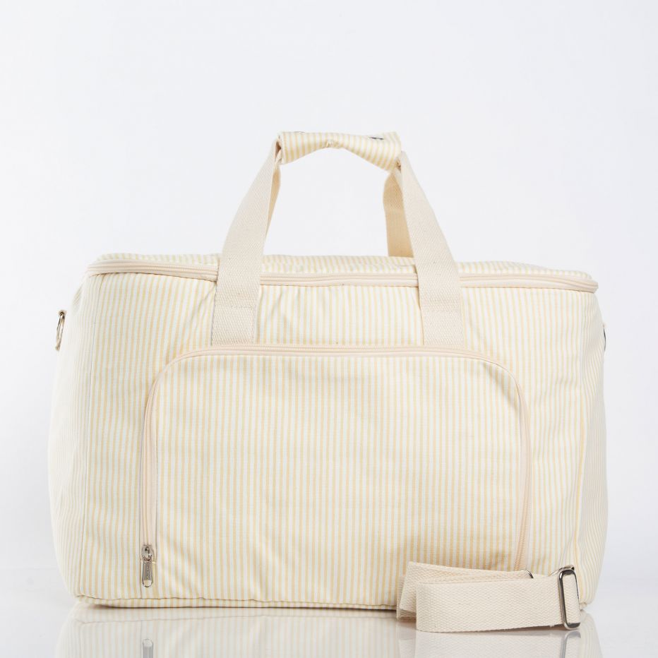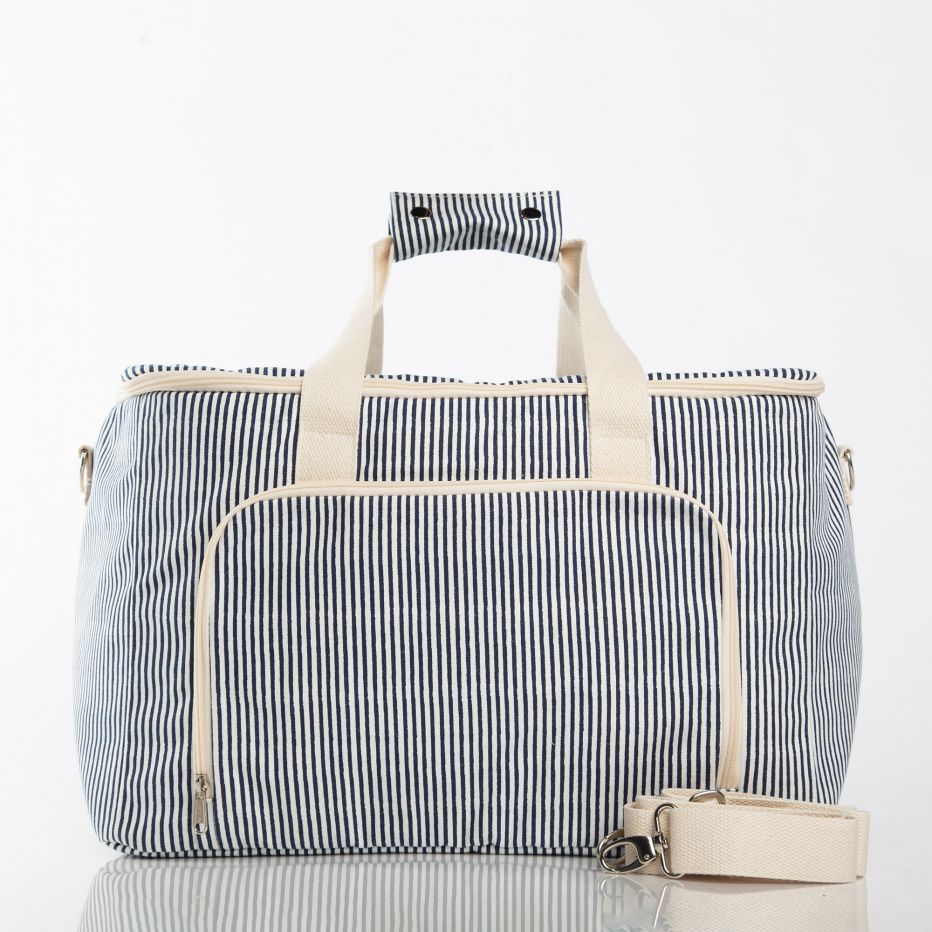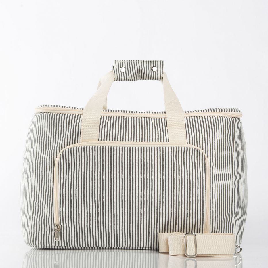 This durable seersucker cooler is perfect for keeping your drinks and eats cold on hot days on the go!  From the beach to the ball fields this cooler can go anywhere and look good while doing it! The natural web handle and 9" handle drop make it easy to carry, while the zip closure with front pocket ensures that your belongings are safe and secure. The USDA approved insulated lining will keep your snacks and drinks cold for hours, making this a must-have for any outdoor lady!