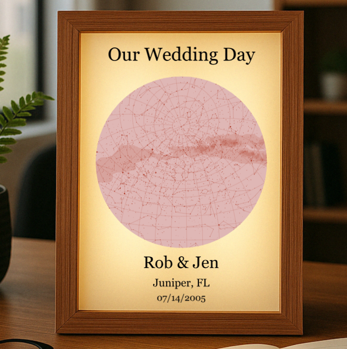 Choose your favorite color for the stars, add your own title, and personalize the bottom with your names, location, and date. It’s the perfect romantic anniversary gift, heartfelt birthday keepsake, or unforgettable wedding present — designed to spark a “Wow!” when opened and cherished for years to come.