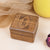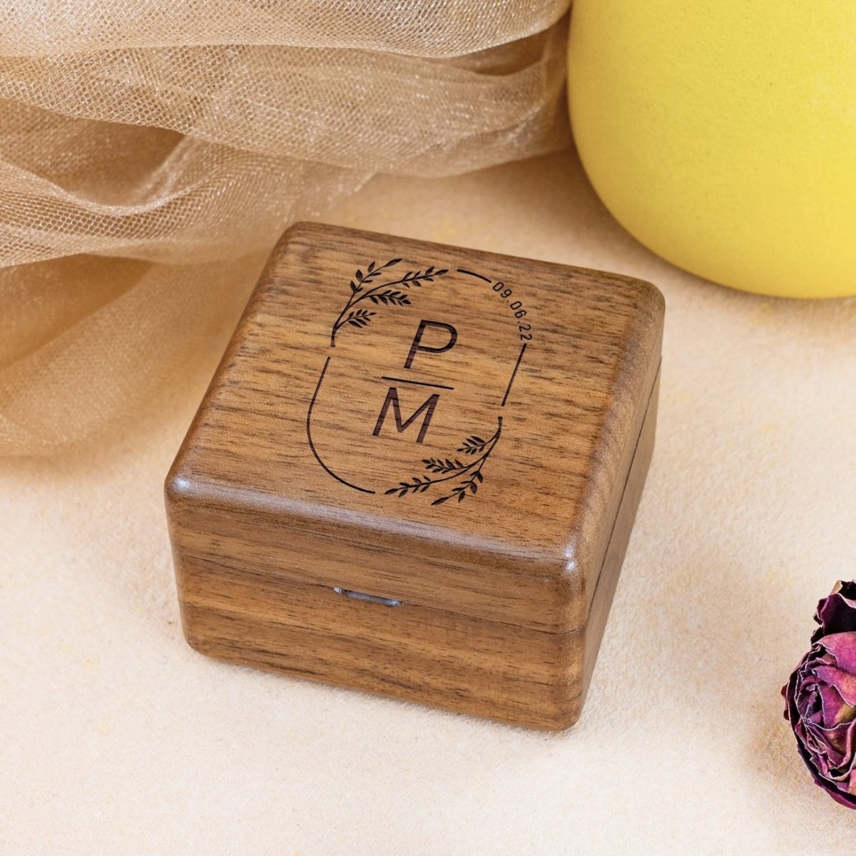 This box is handmade from dark walnut wood and is lined with light velvet foam. It comes with two ring slots so your and your man's rings can stay secure together, and can be personalized with any of the designs shown above. To do this, choose from the drop-down box and add your information to the text box above.
